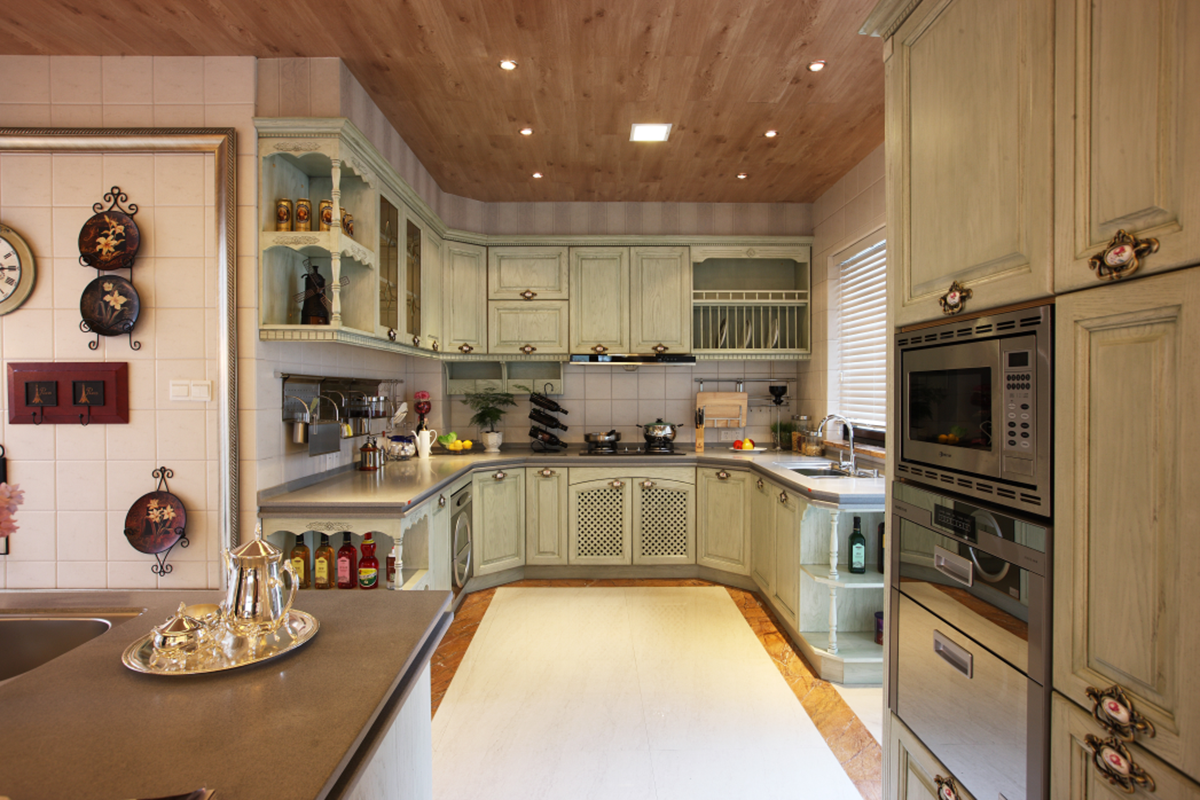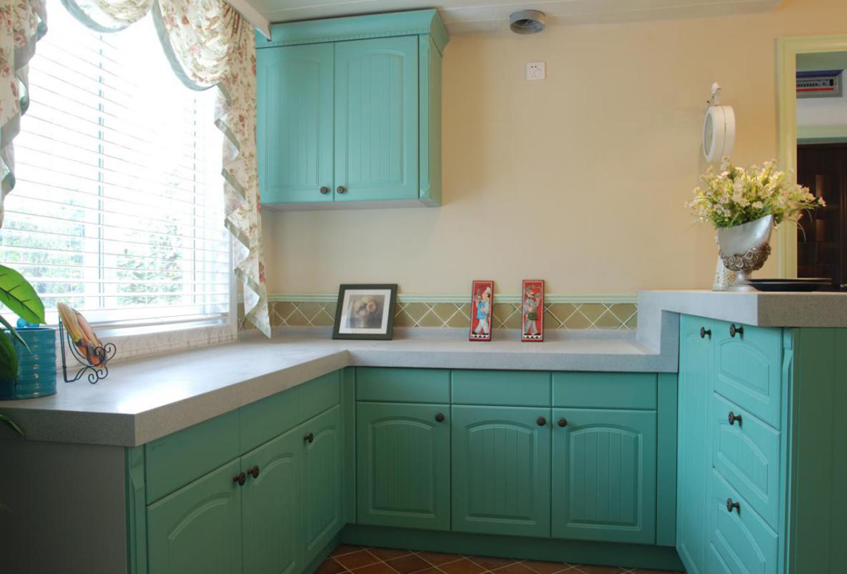 暖而像水一樣透明的陽(yáng)光灑在清新綠為底色的廚房間,仿佛置身田園,歡快而溫馨。運(yùn)用了膜壓的工藝。